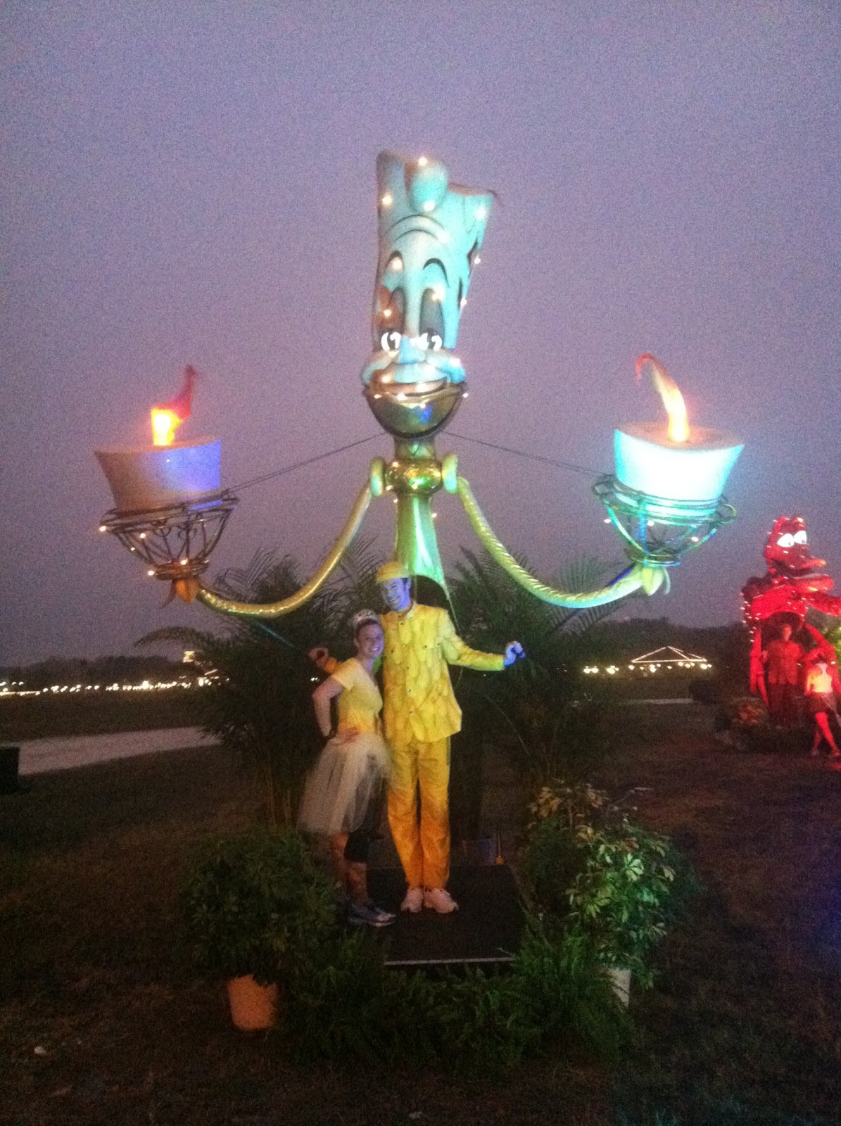 I think the first mile had two bands and a DJ, which was pretty fun. After that, every mile or so there were some characters or set up where you could stop and take your picture. Unfortunately, the lines got pretty long, so Marissa and I opted to skip most of the photo ops. However, I was loosely dressed up as Belle from Beauty and the Beast, so when I saw the Candlestick and no line, I decided to take advantage.
